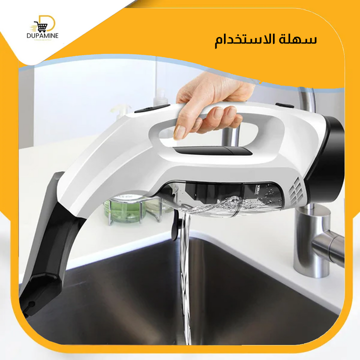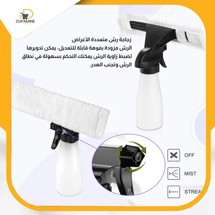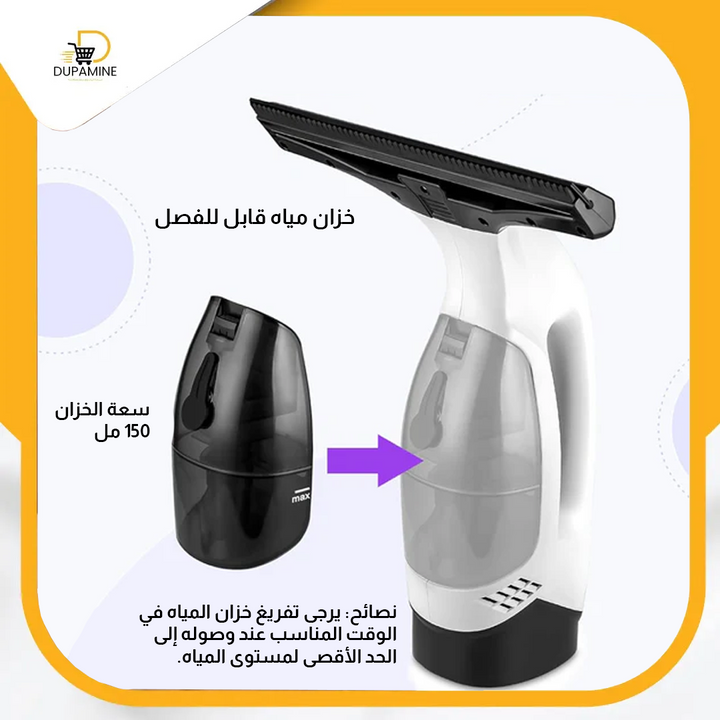 البخاخ الذاتي: يحتوي الجهاز على زجاجة مياه مدمجة يمكن ملؤها بالماء أو منظف النوافذ، مزودة برشاش يوزع السائل بشكل متساوي على الزجاج. هذه الميزة تساهم في تليين الأوساخ والبقع العنيدة، مما يسهل عملية المسح ويعطي نتائج أكثر لمعانًا ووضوحًا.