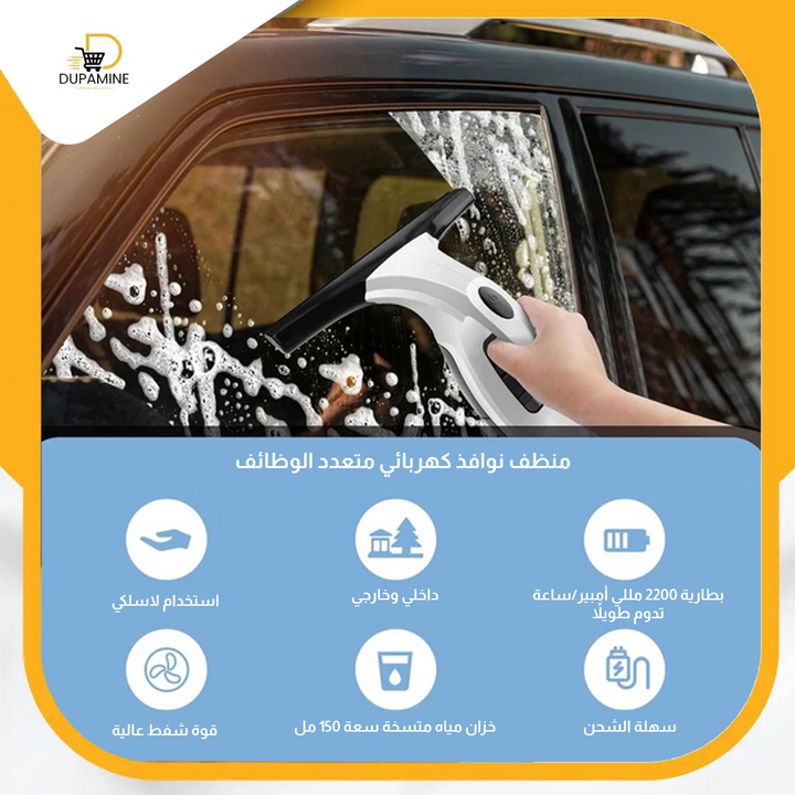 الممسحة الكهربائية: تتميز بشفرات مطاطية عالية الجودة وشفط قوي يساعد على إزالة الماء والأوساخ في خطوة واحدة. هذه الميزة تمنع تكوّن خطوط أو بقع مائية على الزجاج، لتتركه نظيفًا ولامعًا كما لو كان للتو تم تنظيفه على يد محترف.